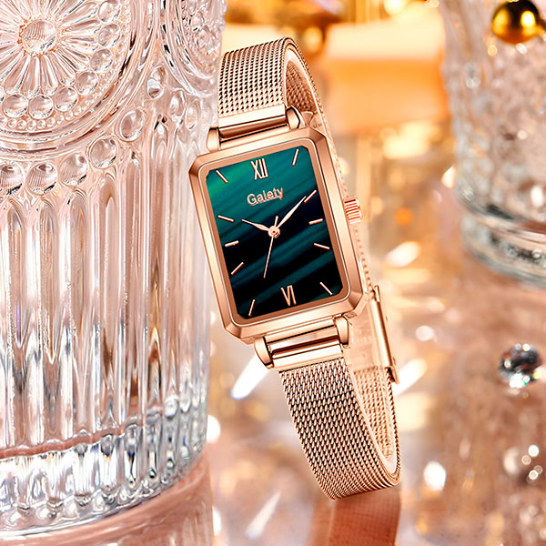 Dit horloge heeft een glanzende roségouden kleur en een prachtige groene wijzerplaat. Het voegt stijl toe aan elke jurk, jeans of formele kleding.