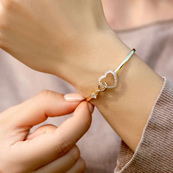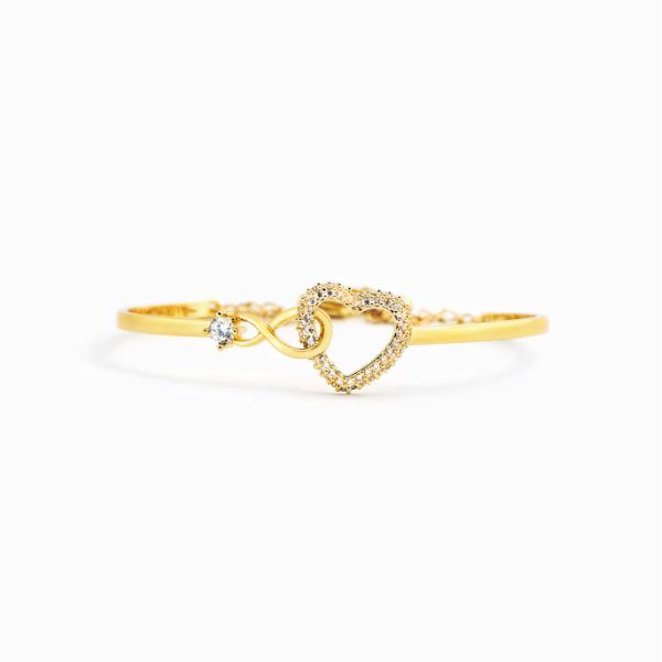 De armband combineert een oneindigheidssymbool met een hartmotief, dat eeuwige liefde en onafscheidelijke verbinding vertegenwoordigt.