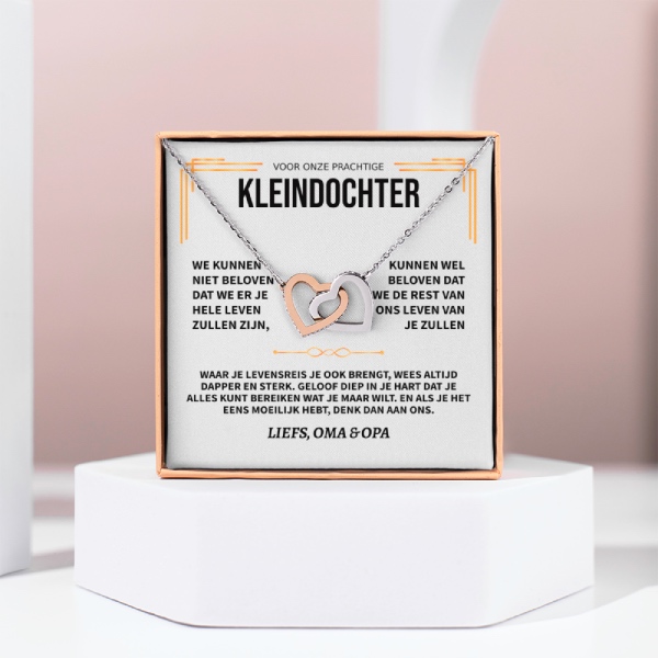 De ketting vertegenwoordigt een prachtig symbool van liefde dat elegant design en diepe emotionele waarde combineert. Deze ketting, met een motief van twee met elkaar verweven harten, vertegenwoordigt saamhorigheid en eeuwige liefde, waardoor het het perfecte cadeau is voor een geliefde.