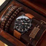 Een set van een horloge en drie armbanden ontworpen voor de moderne man die eenvoud en elegantie waardeert.